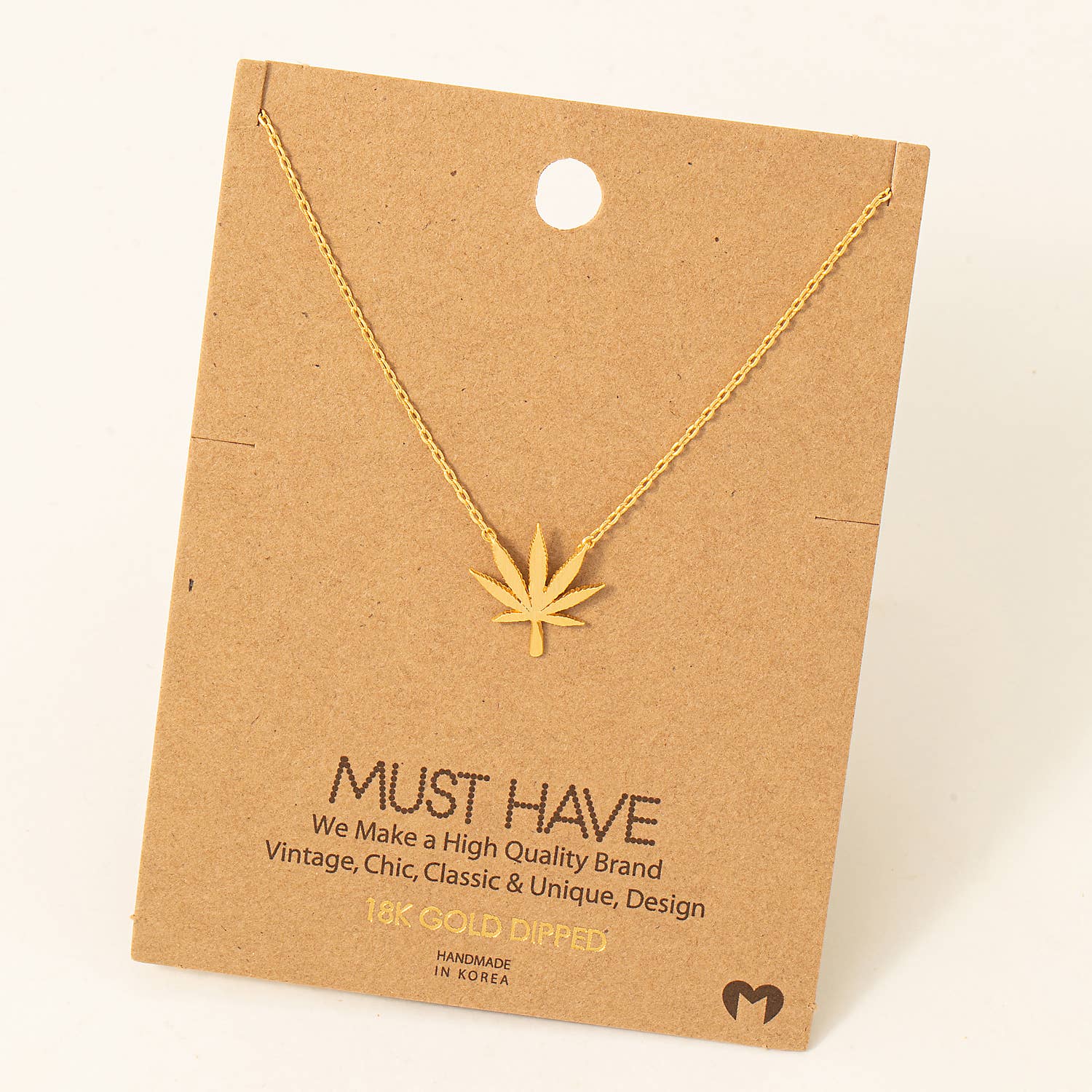 This fashionable necklace features a striking cannabis leaf pendant, perfect for expressing your unique style. Add a bold and versatile statement piece to your collection with this eye-catching accessory. Crafted from 100% brass for lasting quality.